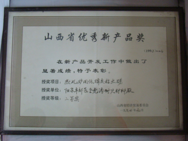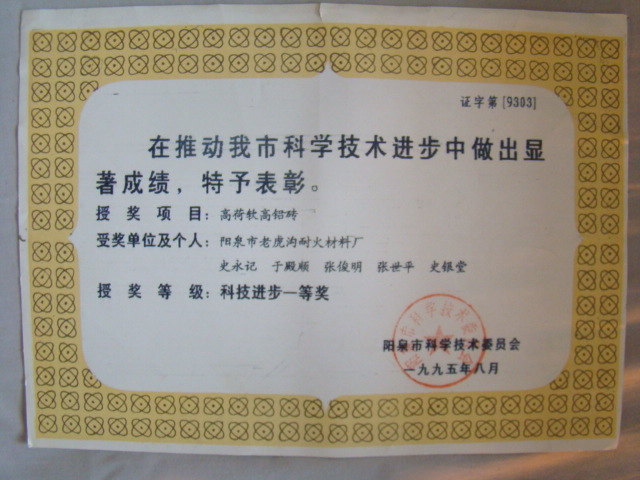 熱風爐用低蠕變高鋁磚、高荷軟高鋁磚獲省科技進步二等獎,微膨脹高鋁磚列入火炬計劃項目,炭素焙燒爐用特種高鋁磚已批準國家專利